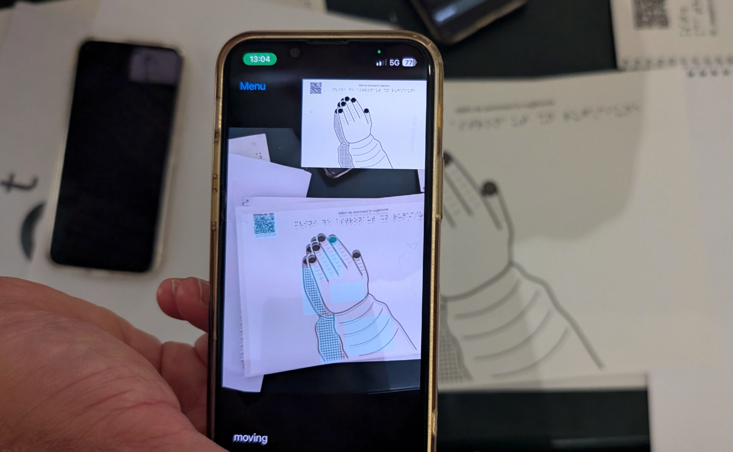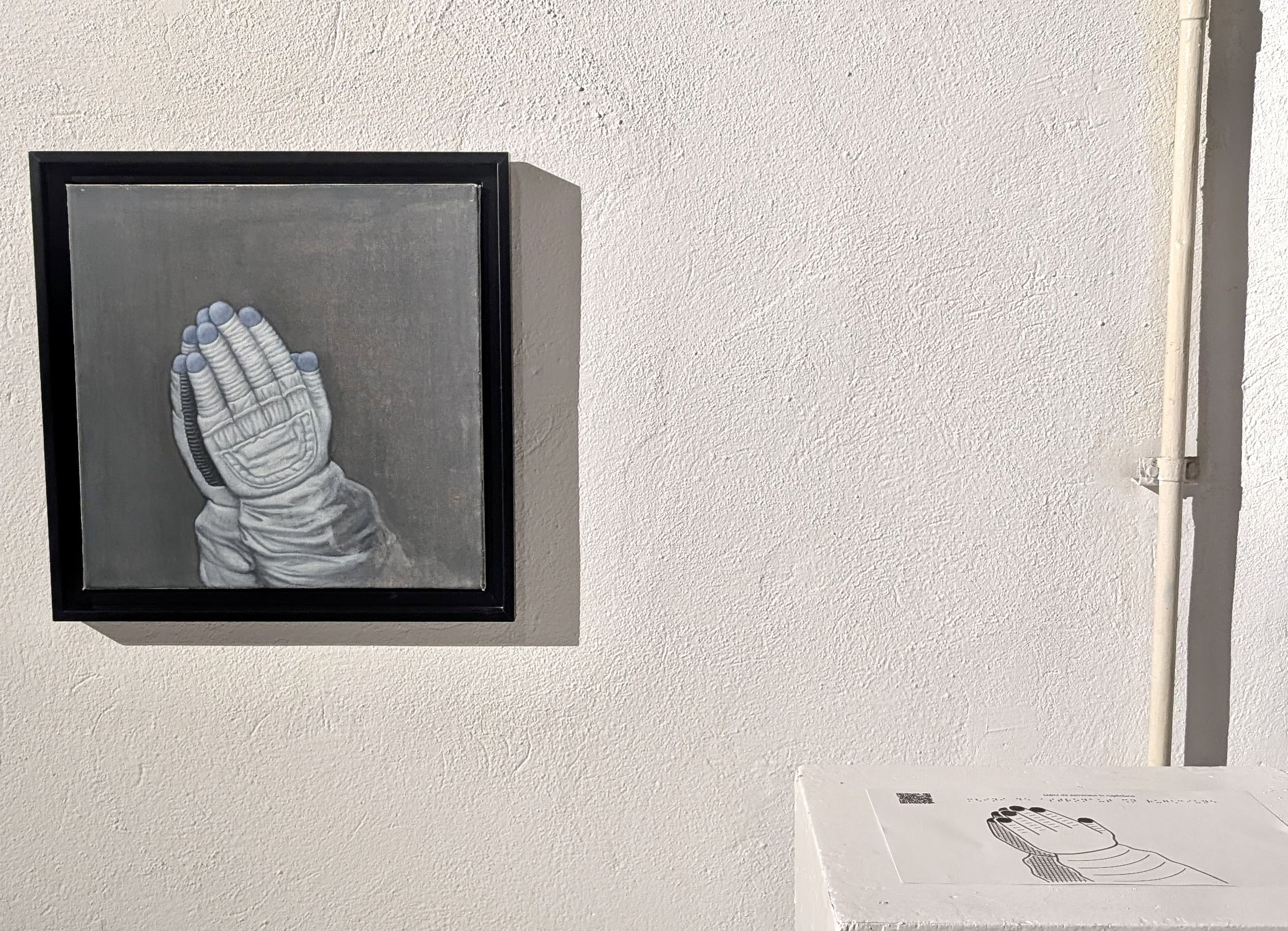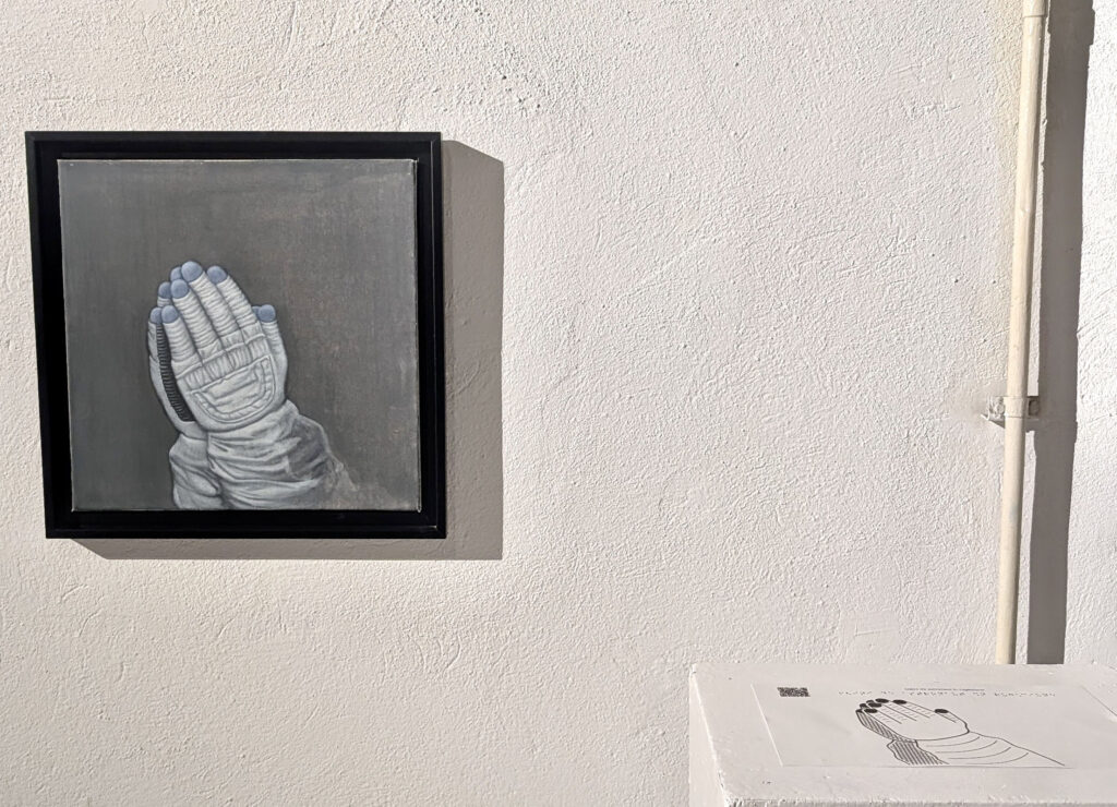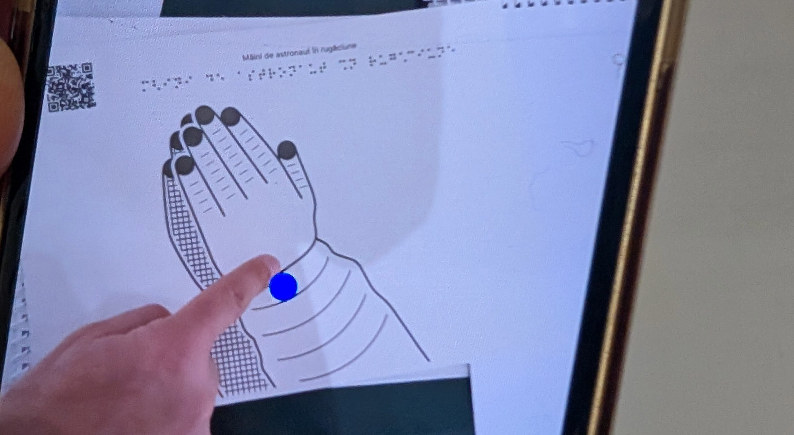 The starting point was Adrian Preda’s work “Astronaut Hands in Prayer” (2015). Artist Dan Patzelt translated the work into a tactile representation using the Tactile Images method, allowing forms, volume, and composition to be perceived through touch (https://tactileimages.org/ro/arta/pictura/maini-de-astronaut-in-rugaciune-acrilic-si-ulei-pe-panza/).